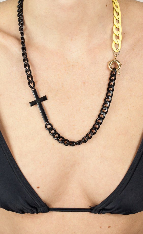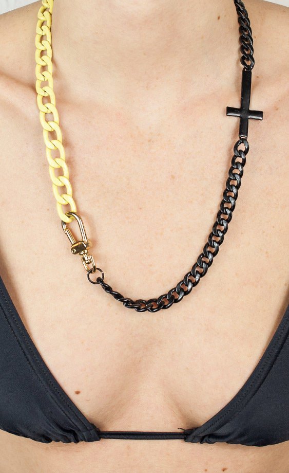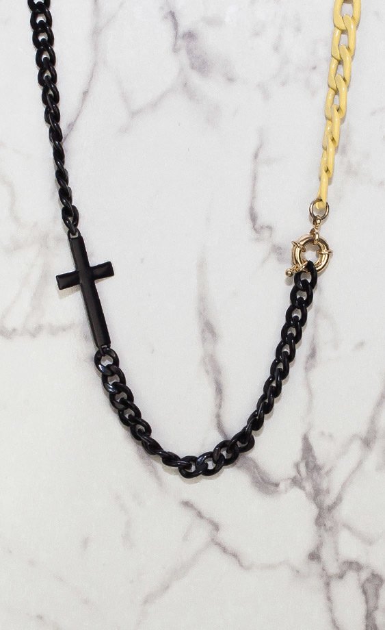 Collier aus zwei verschiedenen Ketten (Gelb/ Schwarz) mit Kreuzanhänger